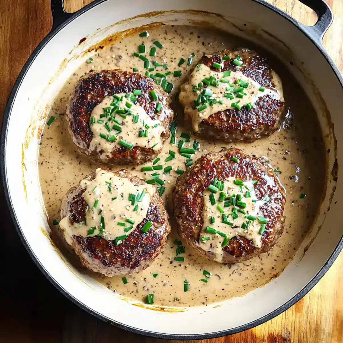 Finally, remove the skillet from heat and garnish your Creamy Whiskey Hamburger Steaks with freshly chopped chives and a sprinkle of black pepper. The vibrant chives add a pop of color and freshness, making your meal not only taste delightful but also visually appealing. Your hearty dish is now ready to be served!
