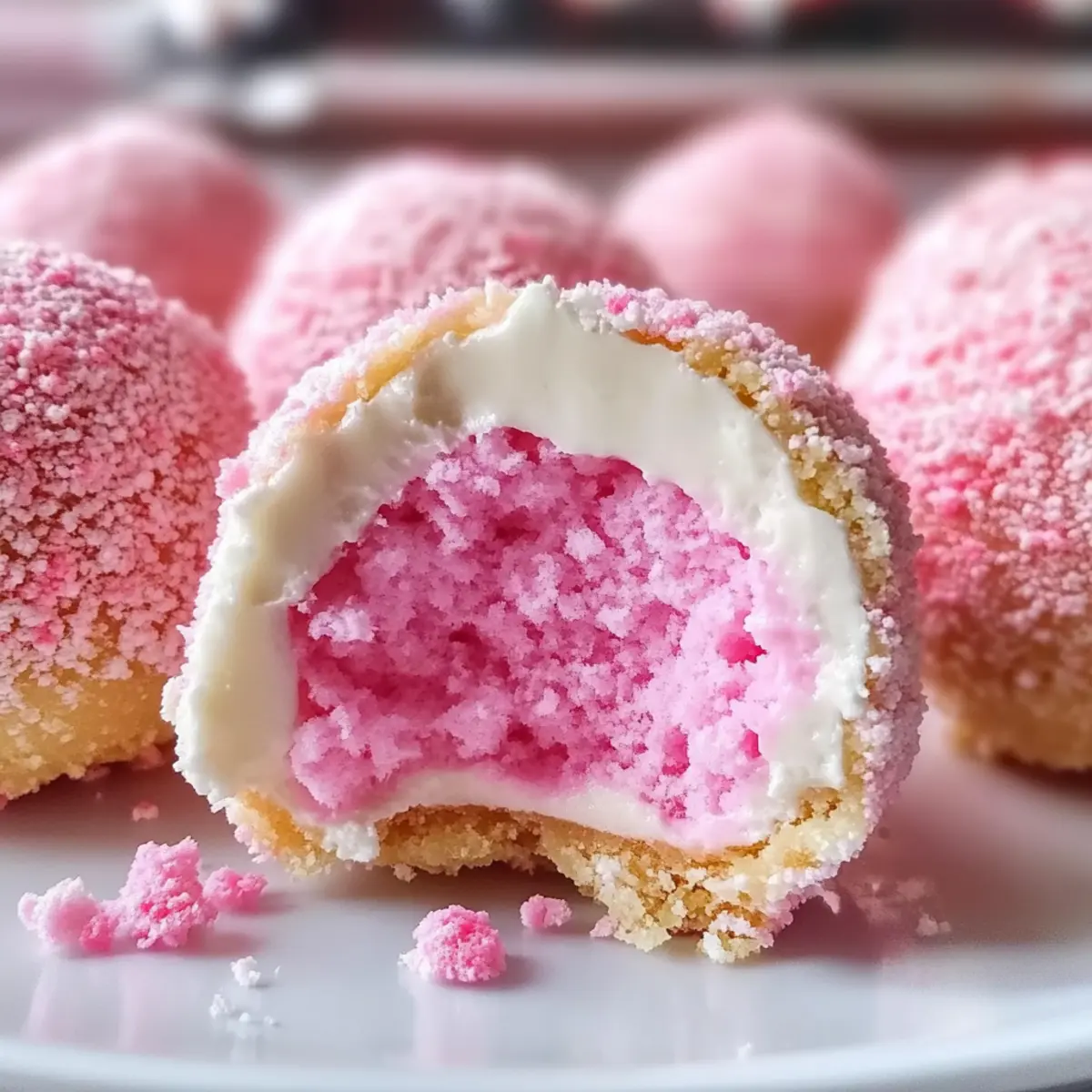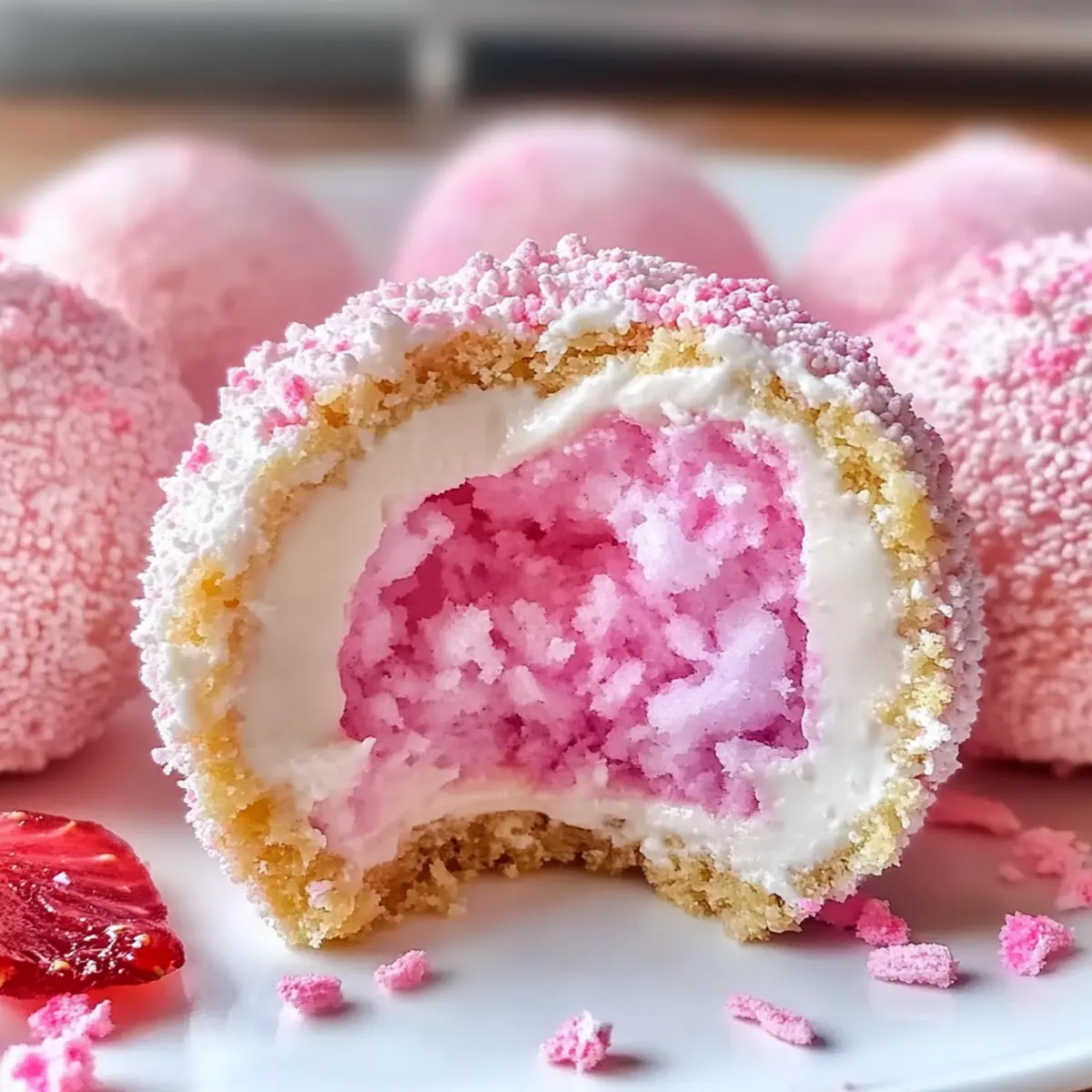 - Prepare your coating by mixing cotton candy-flavored sugar, crushed freeze-dried strawberries, and optional pink sprinkles. Roll each cheesecake bomb in the mixture.