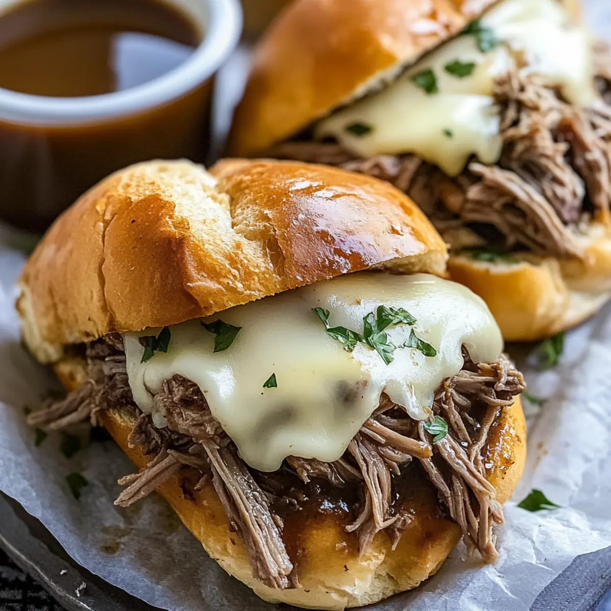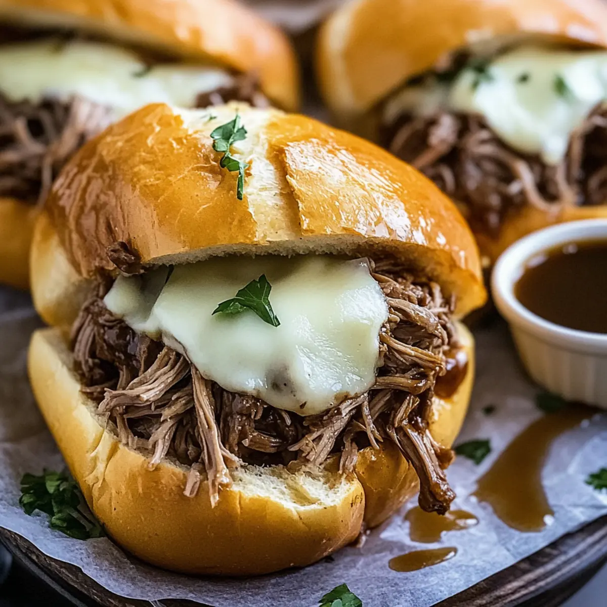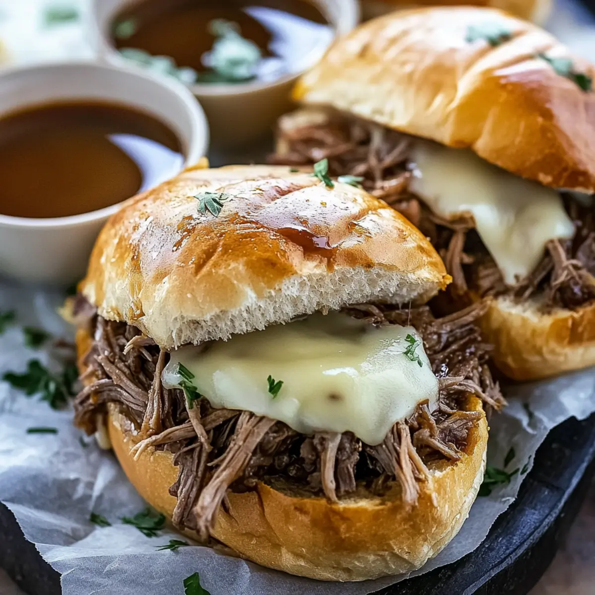 - Assemble the sandwiches with shredded beef and serve with au jus for dipping, garnished with parsley.