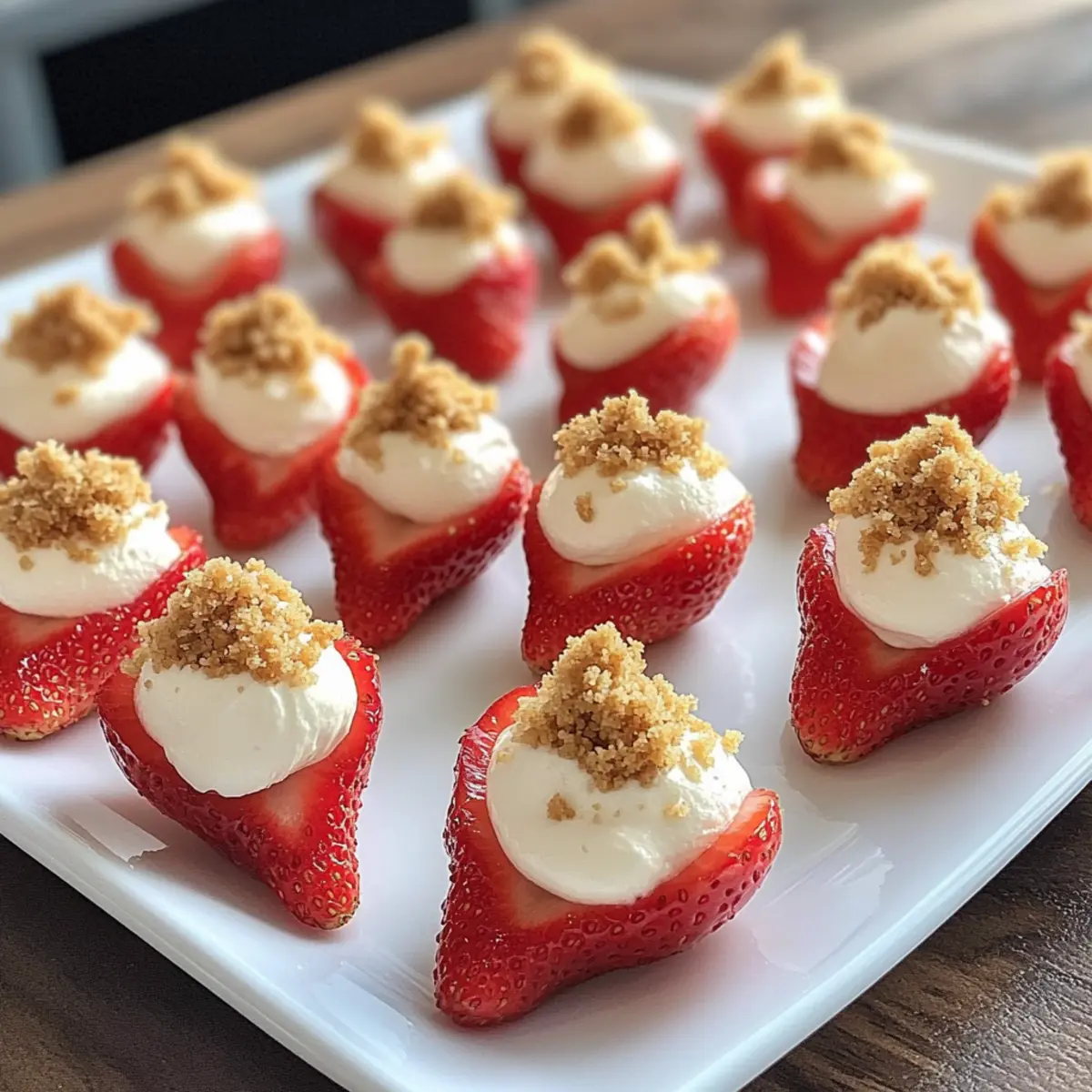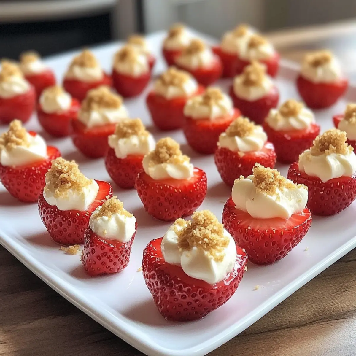 To finish off your deviled strawberries, sprinkle the tops of each filled half with graham cracker crumbs or crushed nuts for added texture and flavor. This not only enhances the presentation but also mimics the crust of a traditional cheesecake. Feel free to adjust quantities to achieve the desired balance of crunch and creaminess.