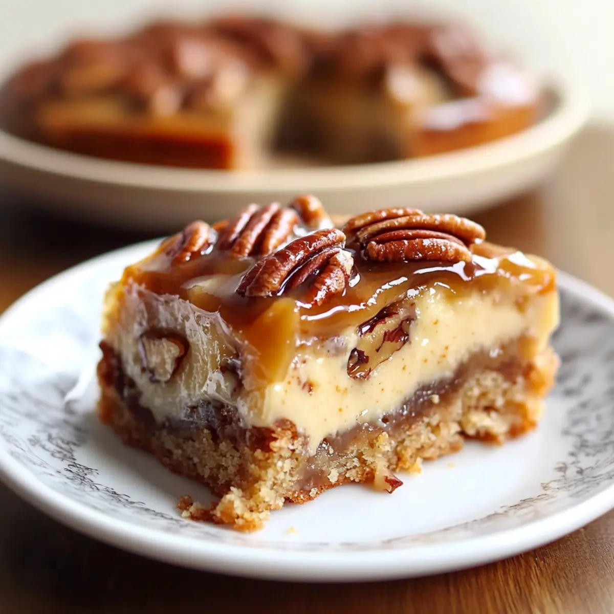 - Pour batter into the prepared pan, sprinkle toasted pecans, and layer the cream cheese mixture on top.