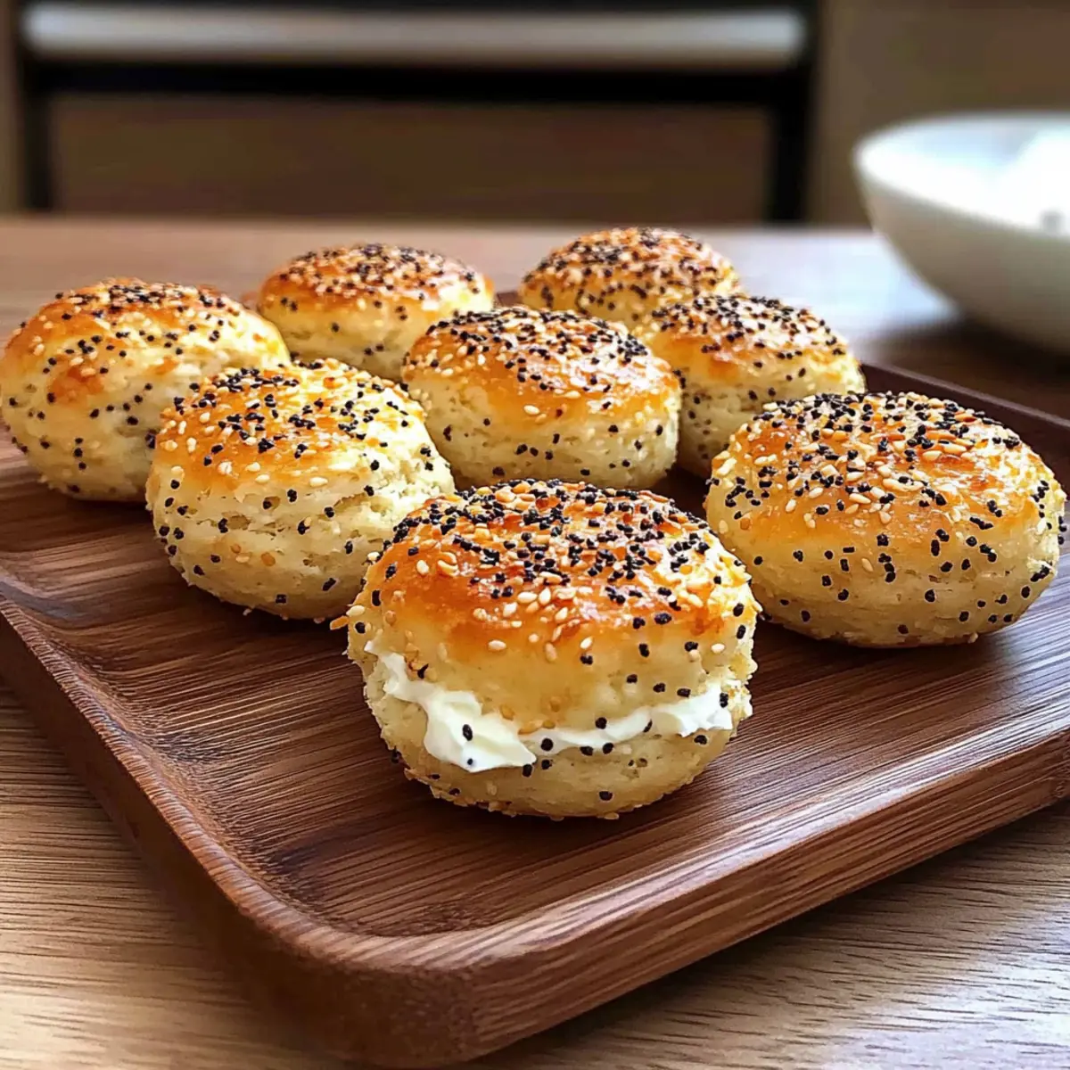 Lightly brush the tops of the bagel bites with an egg wash or a little oil for a golden finish. Sprinkle a generous amount of Everything But The Bagel seasoning over each one, allowing the flavors to enhance the overall taste perfectly. This step adds a visually appealing crust that you will love!