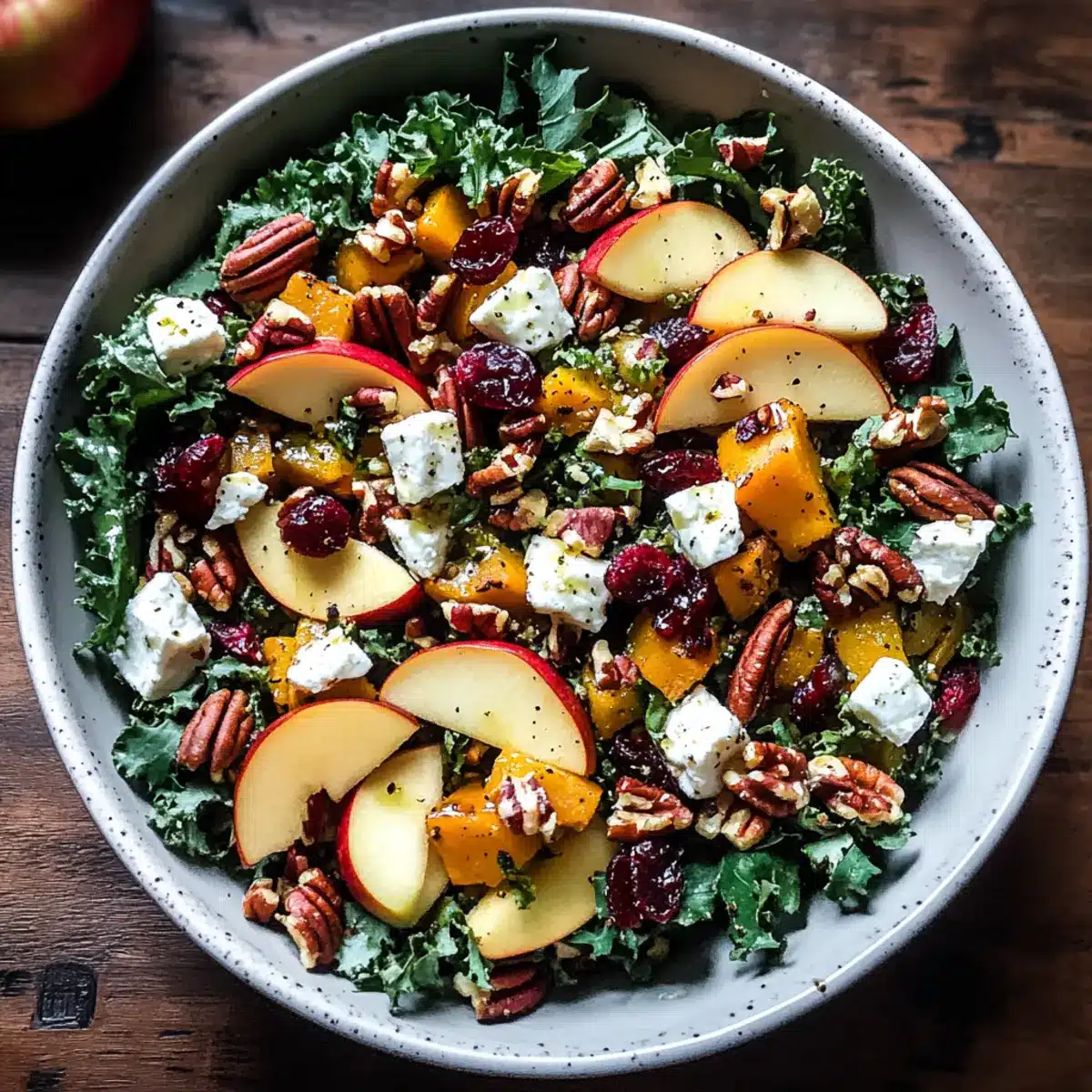 Once the butternut squash is roasted and slightly cooled, it’s time to layer the components. Add the sliced Honeycrisp apples, warm roasted squash, crumbled feta cheese, dried cranberries, and chopped pecans to the bowl with the greens and onion. Drizzle the vinaigrette over the top, then gently toss everything together to combine the flavors without wilting the greens.