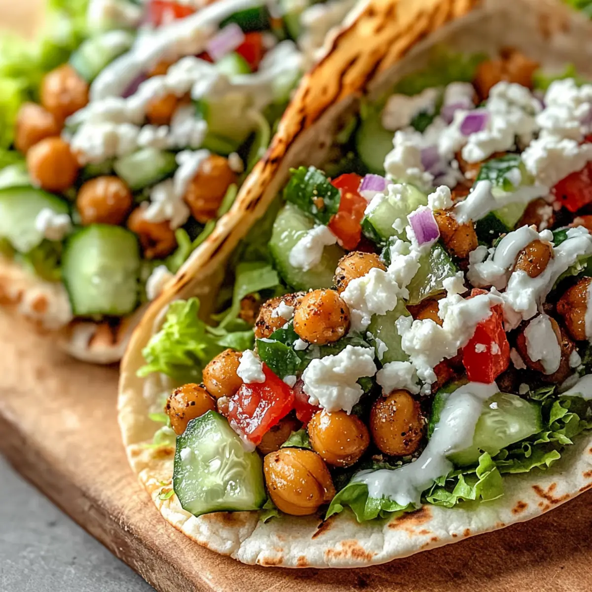 Generously top each taco with a delightful mix of shredded lettuce, diced tomatoes, cucumbers, and diced red onions. These fresh ingredients will add crunch and brightness, perfectly balancing the warm chickpeas. Feel free to customize your toppings according to your taste—that’s the beauty of these Mediterranean Chickpea Pita Tacos!