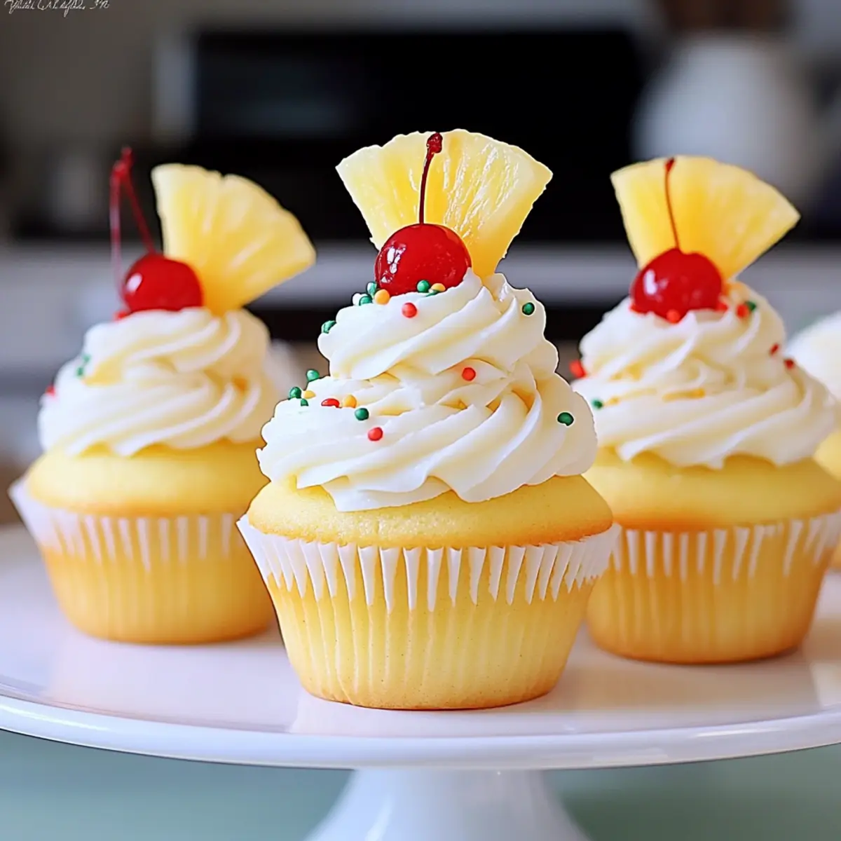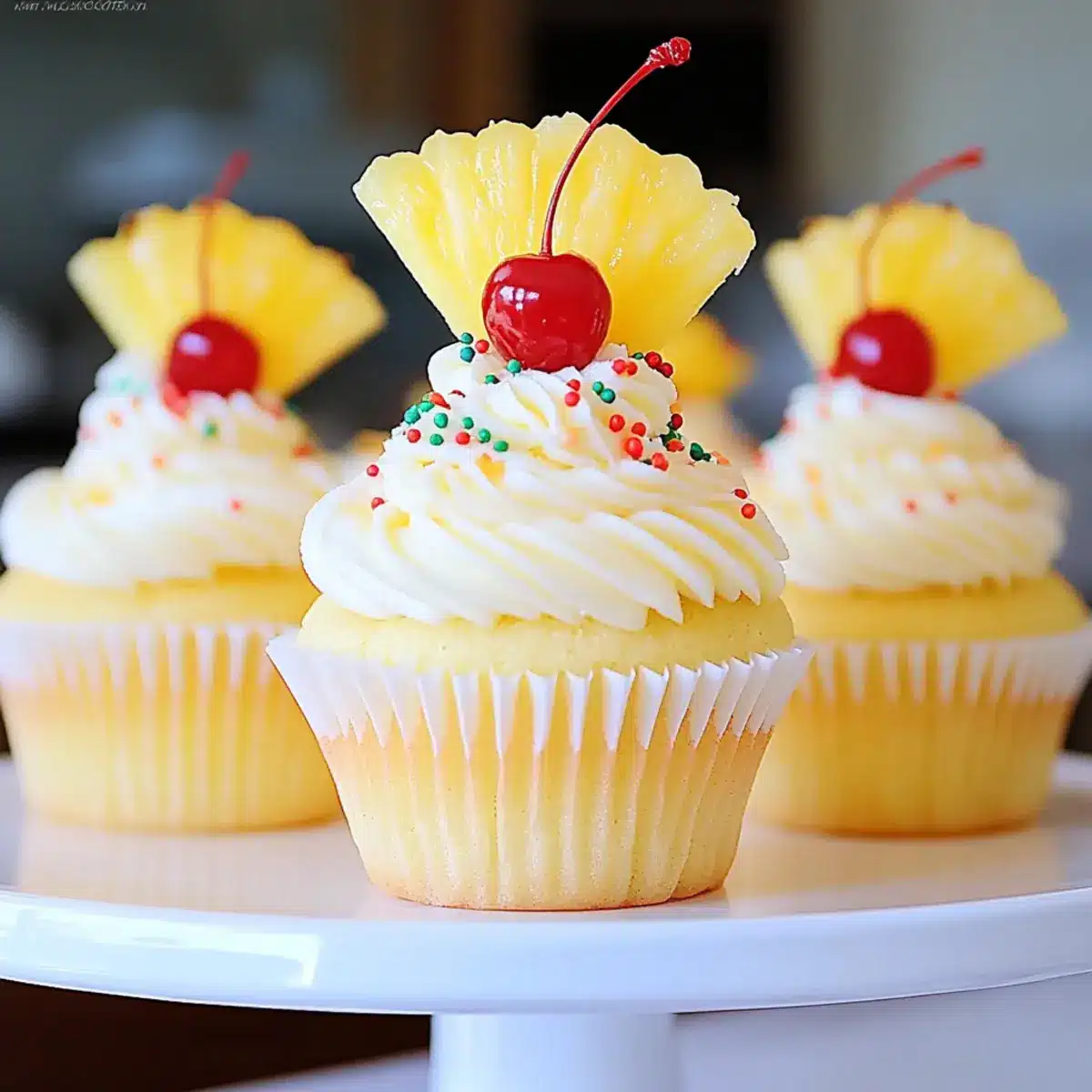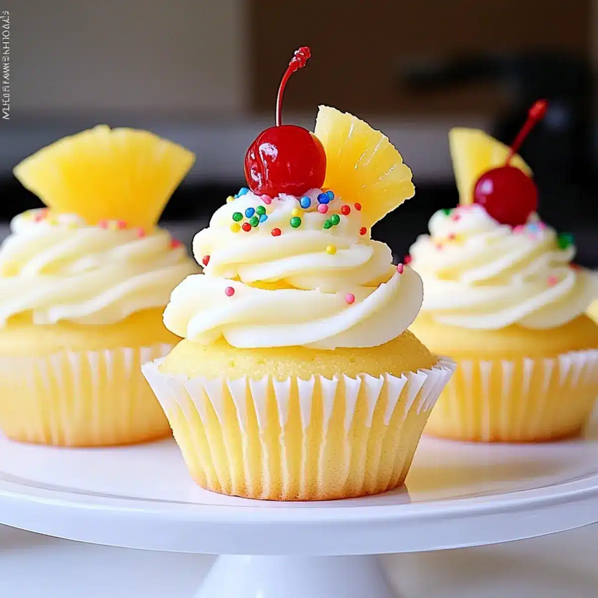 To finish, top each frosted cupcake with a cherry and a sprinkle of colorful sprinkles. This fun and vibrant decoration not only adds a pop of color but also enhances the tropical theme of your Pineapple Cream Cupcakes, making them perfect for any occasion!