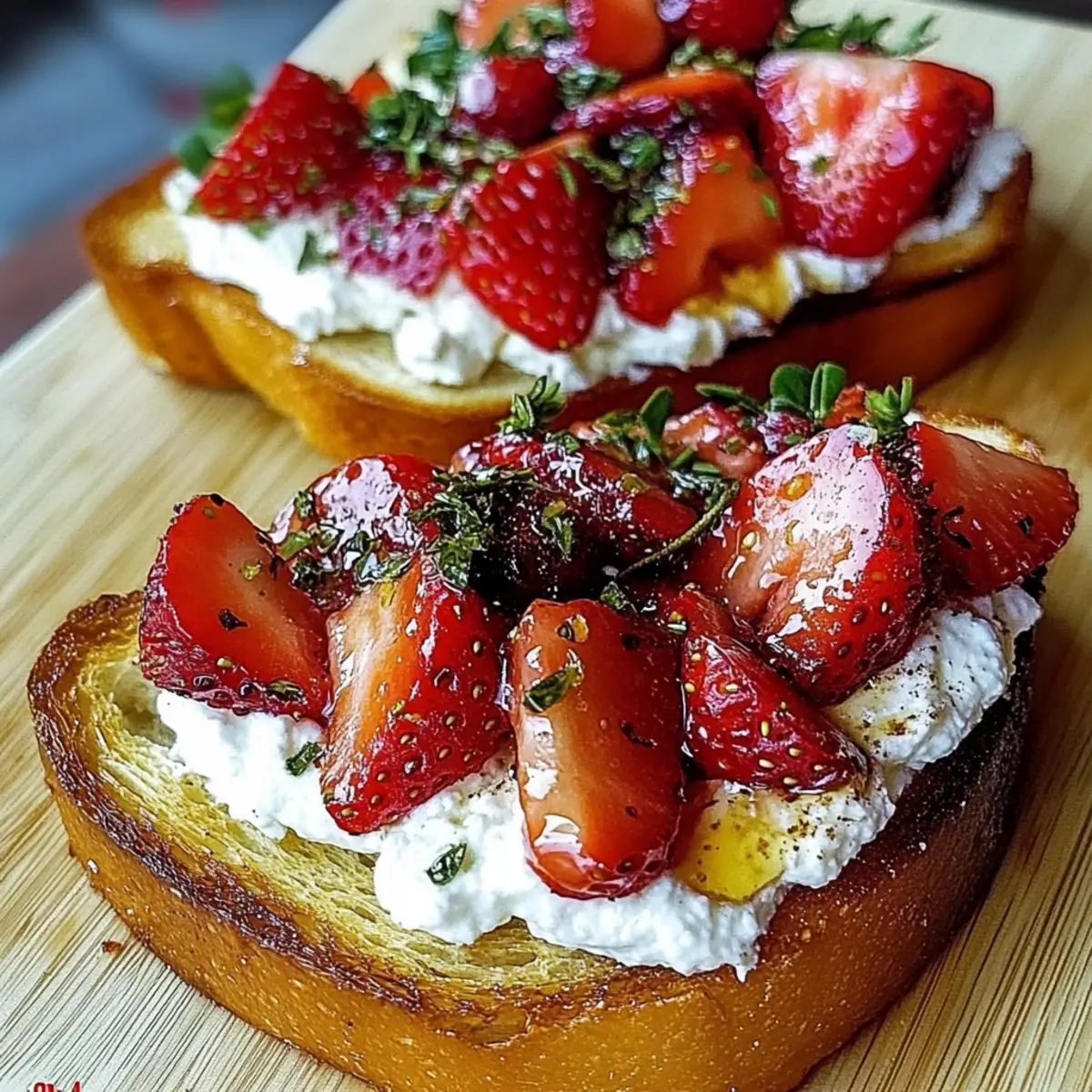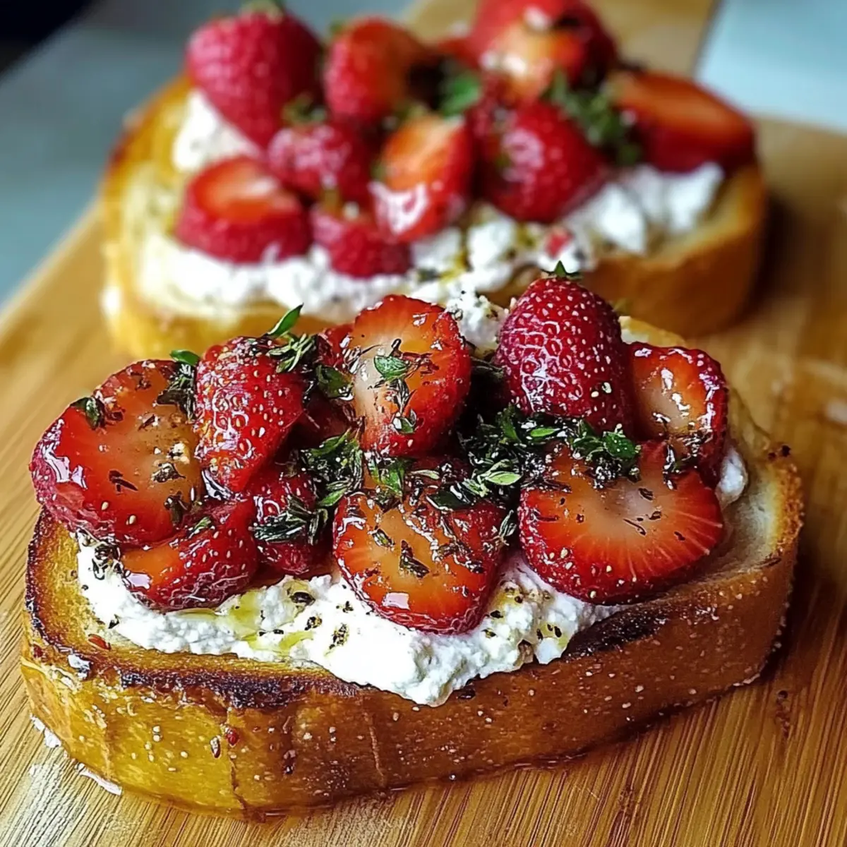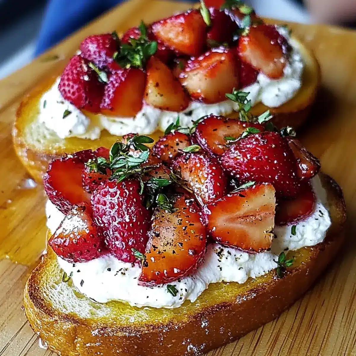 - Spread whipped ricotta on toasted bread, top with roasted strawberries and syrup, and garnish with thyme. Drizzle more honey if desired.