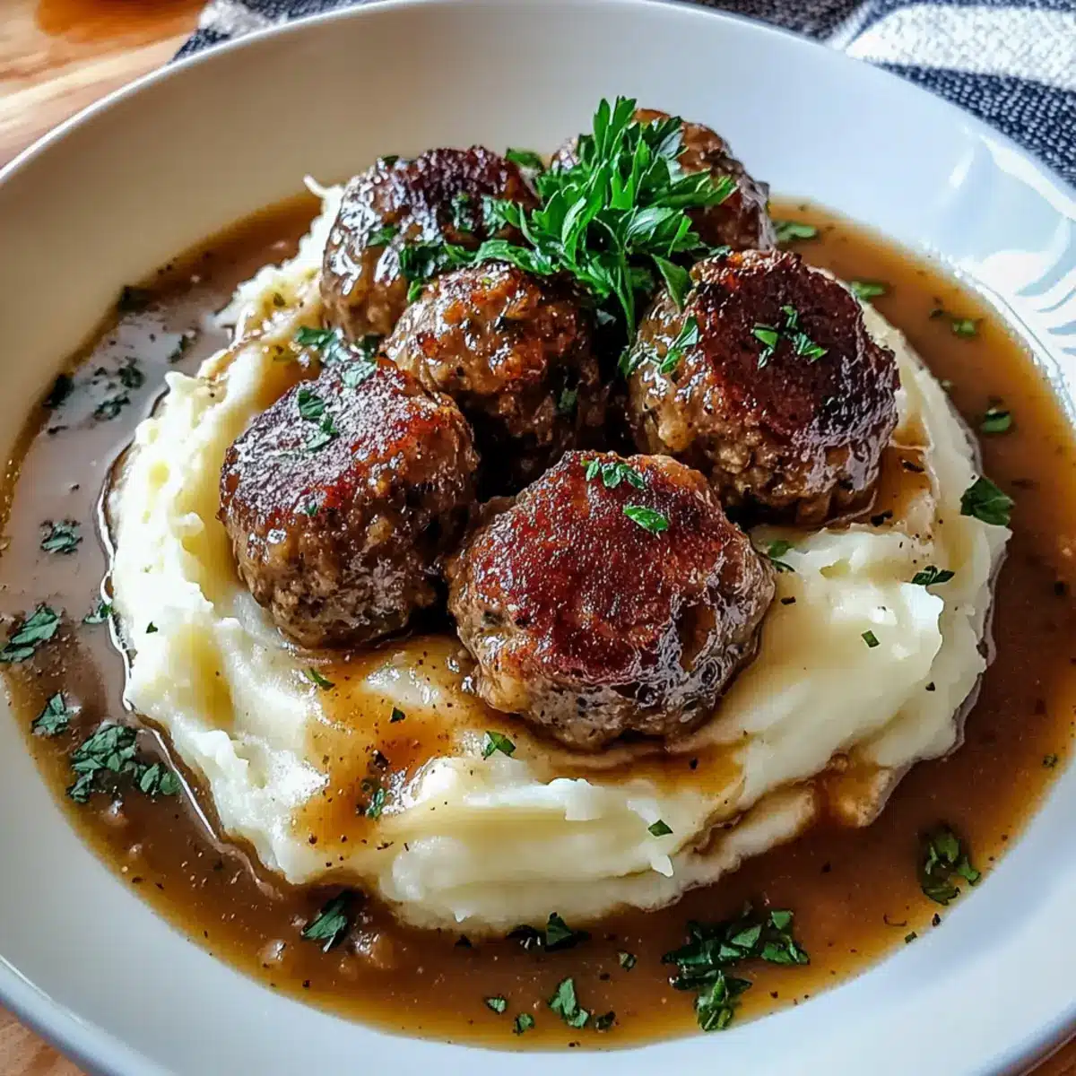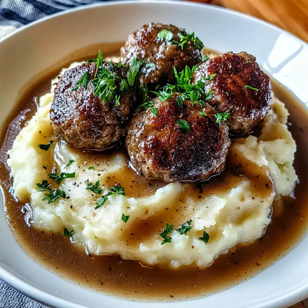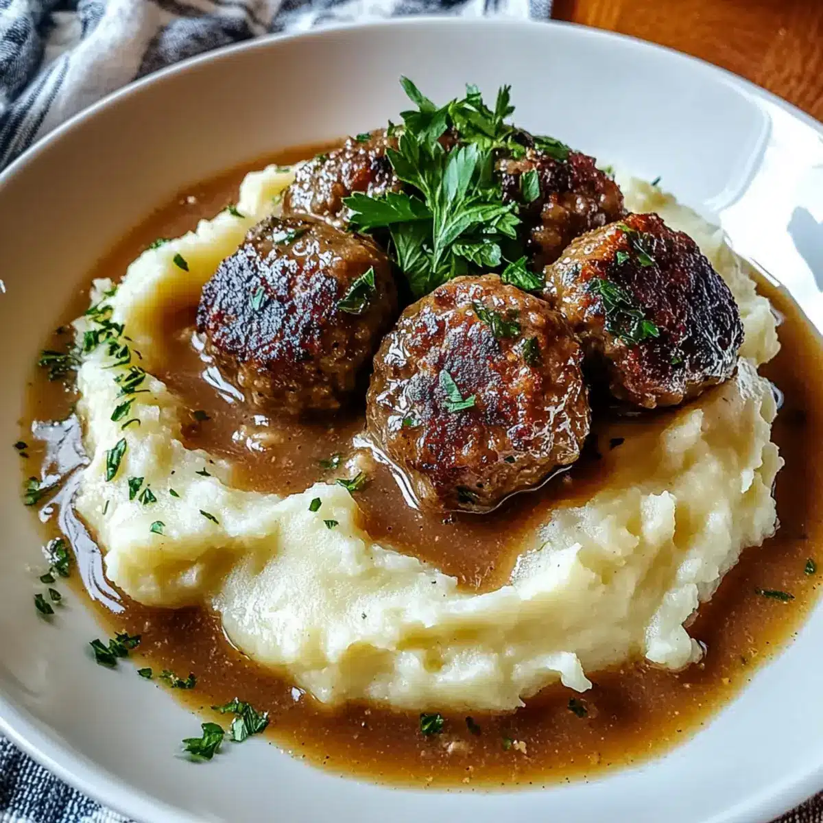 Savor Salisbury Steak Meatballs with Garlic Herb Mashed Potatoes