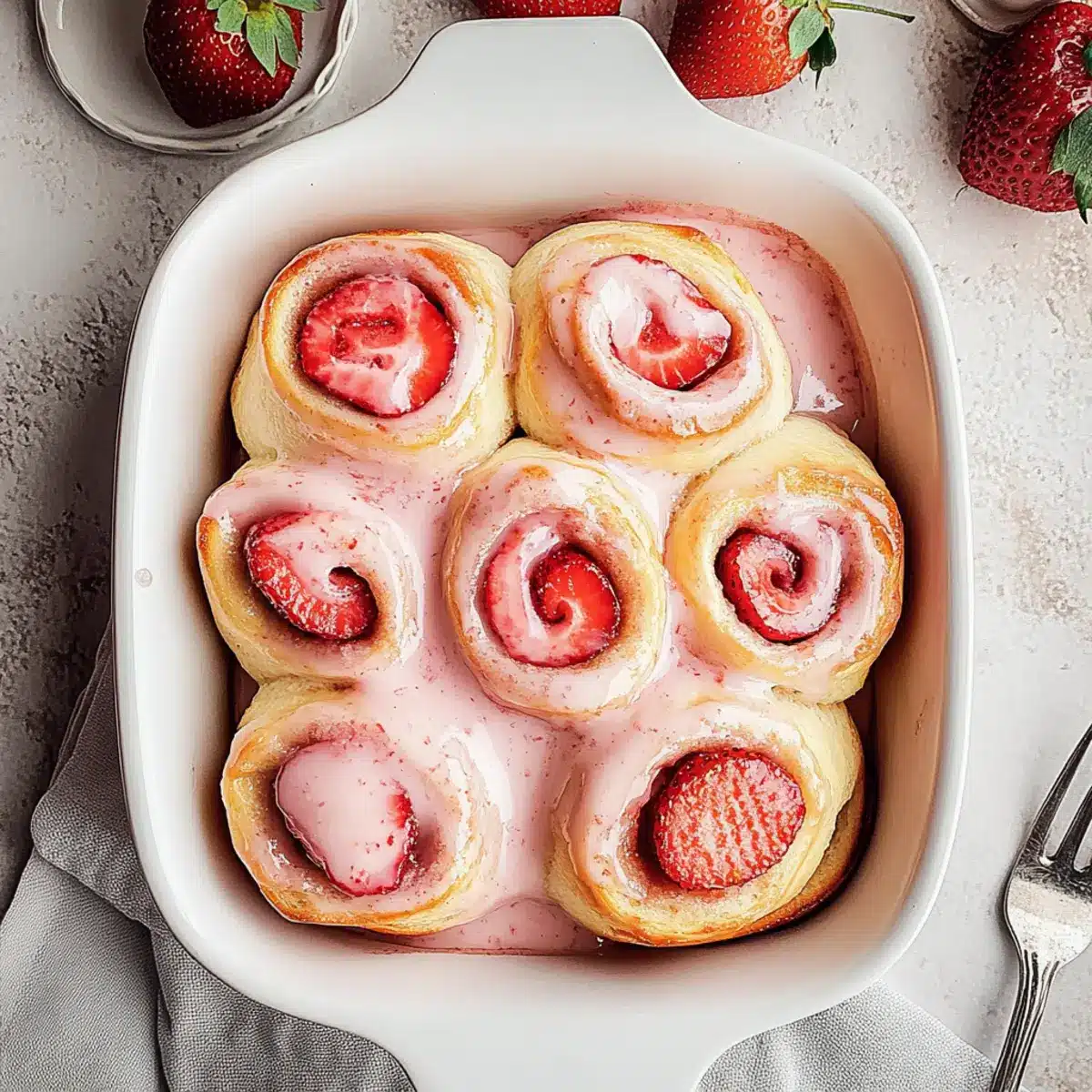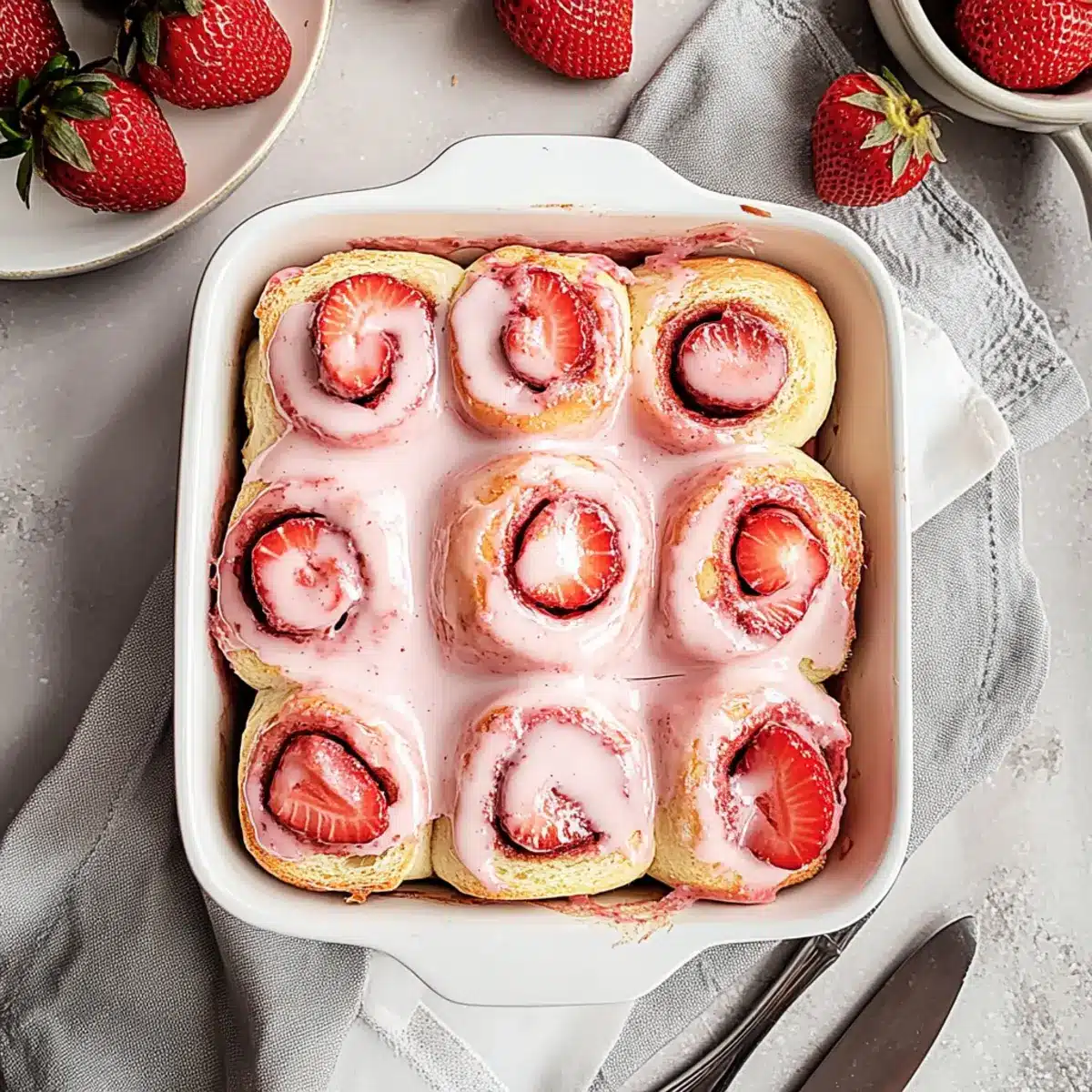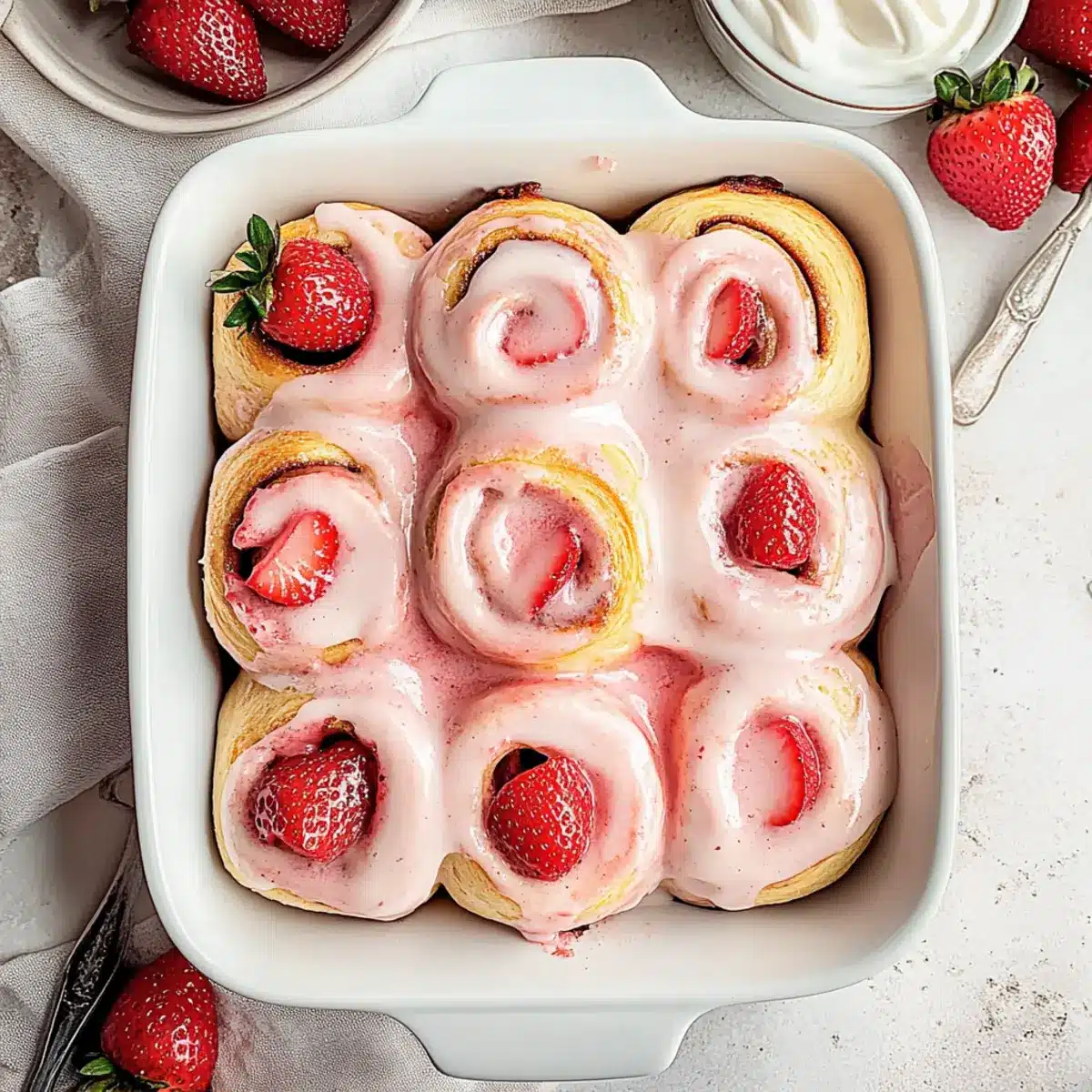 After baking, remove the Strawberry Cinnamon Rolls from the oven and let them cool slightly in the dish for about 5-10 minutes. Generously spread the creamy glaze over the warm rolls for maximum indulgence, allowing it to melt into every nook and cranny before serving immediately.